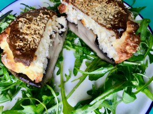 Twice baked cheese soufflés on mushroom steaks