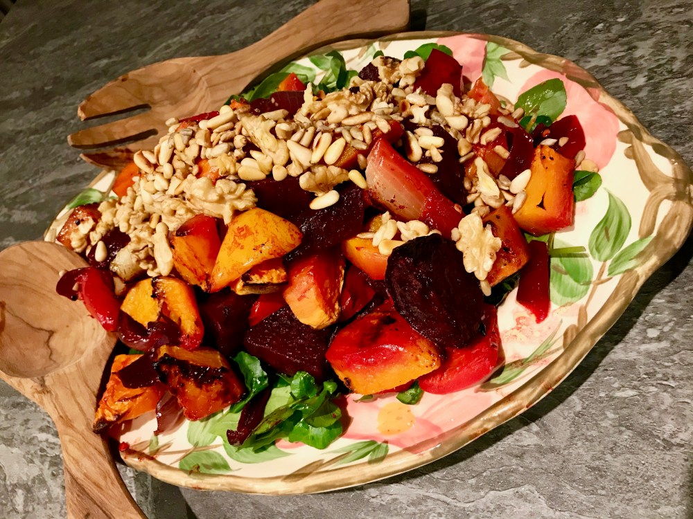 - Lay the vegetables over a bed of salad leaves, dress with the oil and vinegar and sprinkle the nuts and seeds on top.