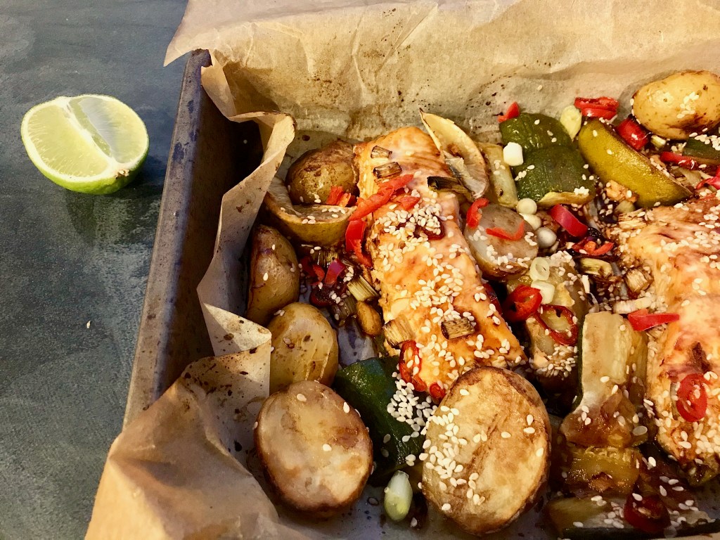 I usually eat fish two or three times a week so this salmon recipe fits nicely into my dietary repertoire. I love the soy and sesame flavours. Using toasted sesame oil to sprinkle on the ingredients before they go into the oven makes a nice change from my usual olive oil. It’s worth doubling up ingredients to eat as leftovers the next day – flake the salmon into a salad for example.