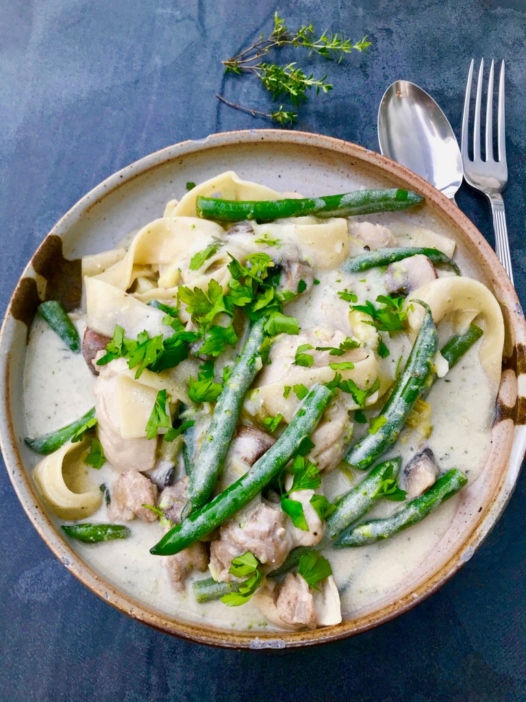 - Add the mushrooms and return the chicken pieces to the pan. Add the fresh thyme, salt and pepper and a few glugs of the pasta water. Stir well, cooking for a couple of minutes.