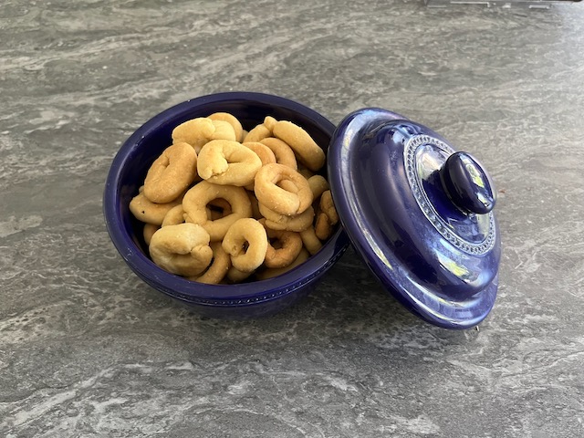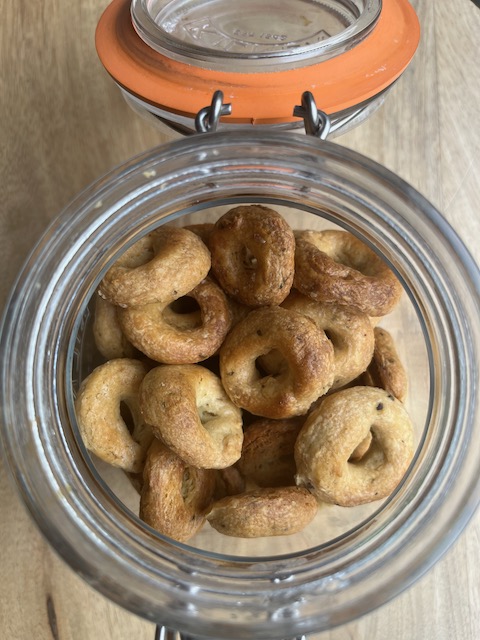 We made both sweet and savoury taralli on the retreat and I bought a big batch home with me. They lasted for about 10 days and I had so many I gave away several to friends and family (they make great presents). I have just made another batch of the savoury version using cracked black pepper in one batch and oregano in another. I love piling them into storage jars for display in the kitchen.