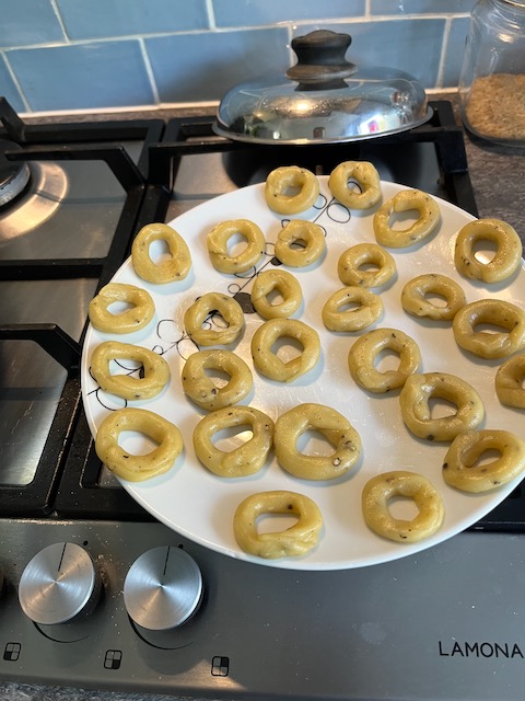 Taralli can be plain or spiced up with chilli, black pepper, oregano or fennel seeds. I’m planning to experiment with some other flavours.