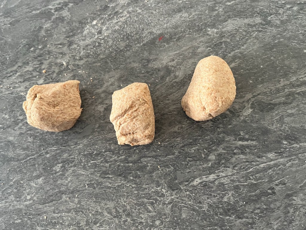 - Lightly flour the work surface, cut the dough into three equal pieces and roll into balls.