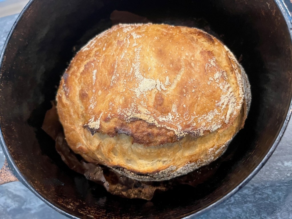 7. Using the spatula and a large spoon or dough scraper, transfer the dough to the casserole in one go – it will be sticky so don’t try and shape it – just plop it in. Add the lid and put in the oven for 35 minutes.