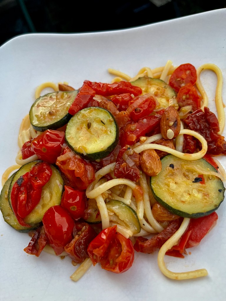 I’m having a phase of eating plant based meals. Tonight I cooked a simple pasta dinner using a handful of ingredients I happened to have in stock. These included sun dried tomatoes and roasted red peppers (both from jars and neither ultra processed). I also used courgettes, onions, cherry tomatoes, almonds (good protein) and spaghetti.